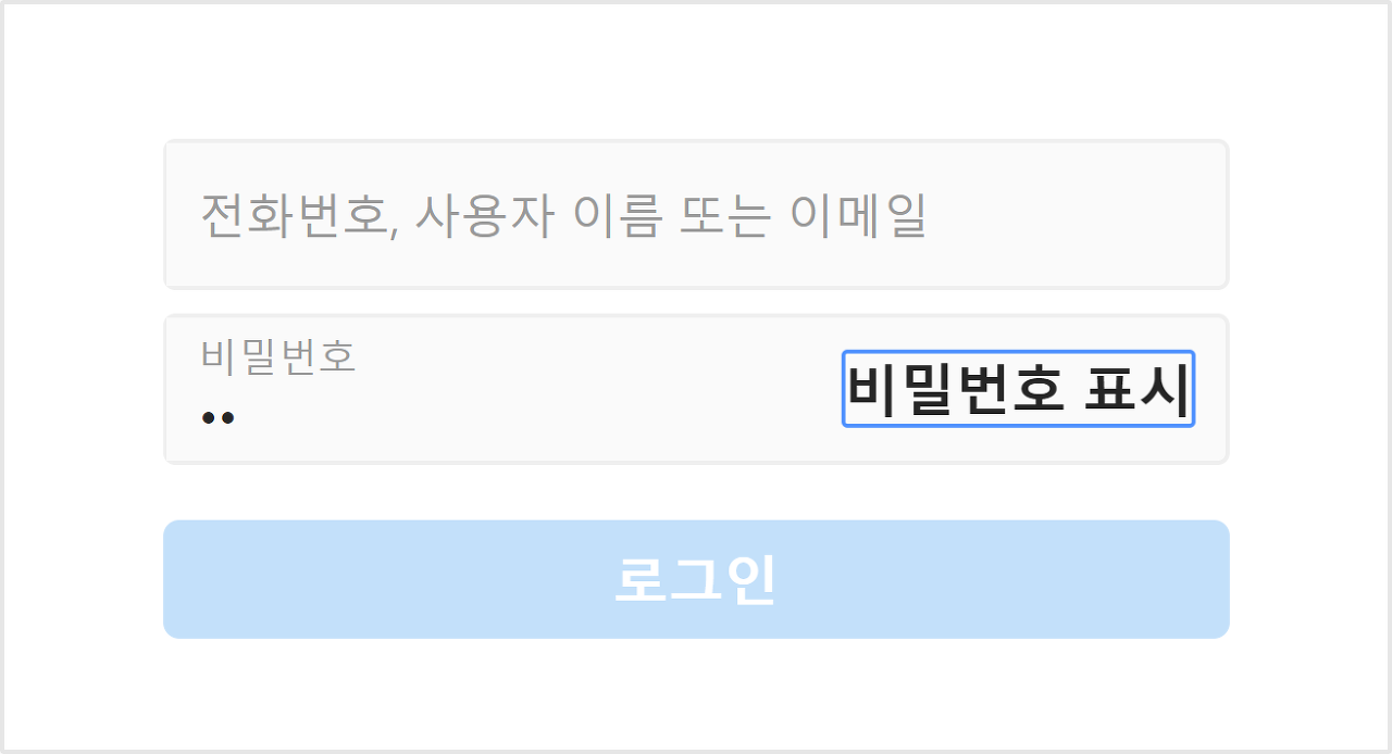 예시의 ‘비밀번호 표시' 버튼은 마우스 클릭으로는 작동이 되지만, 키보드로는 초점 진입만 가능하고 키 입력을 통해 작동이 되지 않습니다. 이러한 경우 키보드 사용자는 로그인 버튼을 누른 후에야 자신의 입력이 올바르지 않았음을 알게 되지만, 무엇을 잘못 입력했는지는 알 수 없습니다.