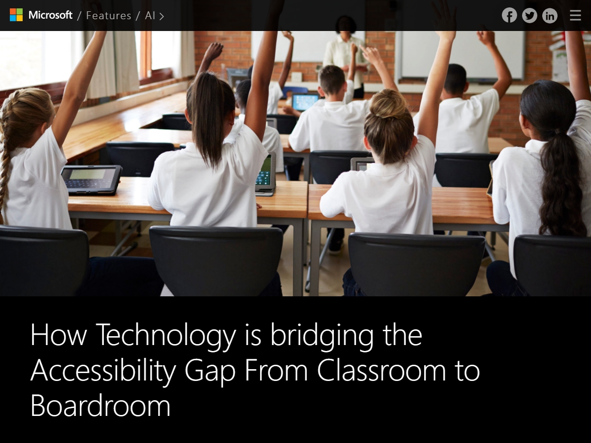 마이크로소프트는 BETT 2020(education technology show)에서 장애 학생들이 기술의 도움을 받아 학교 수업에 참여하는 사례를 발표했습니다. 학교 교육은 사회적 기술을 배우고, 미래 직업에 필요한 기술을 배우는 시간이기에 장애에 상관 없이 누구나 접근할 수 있어야 합니다.